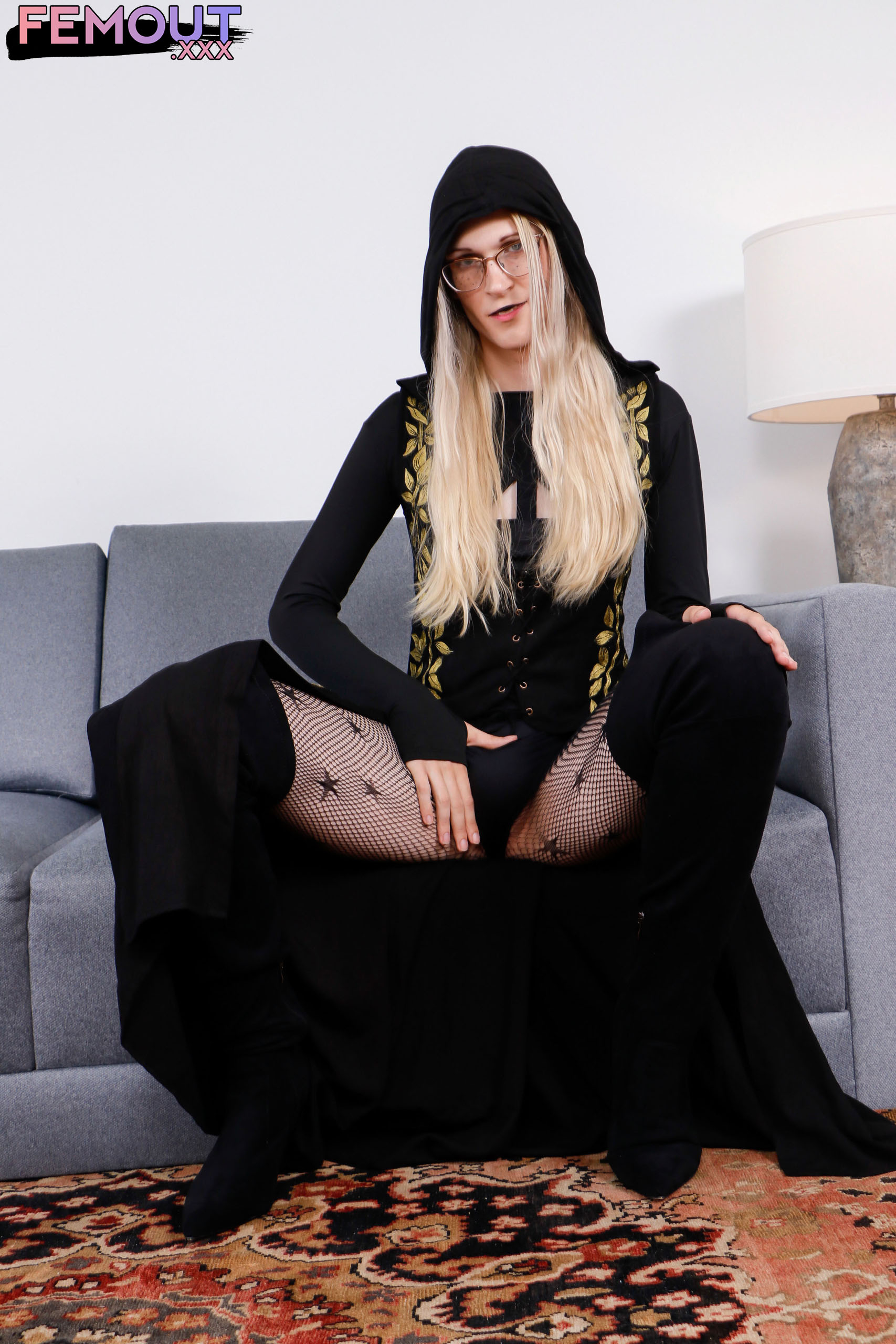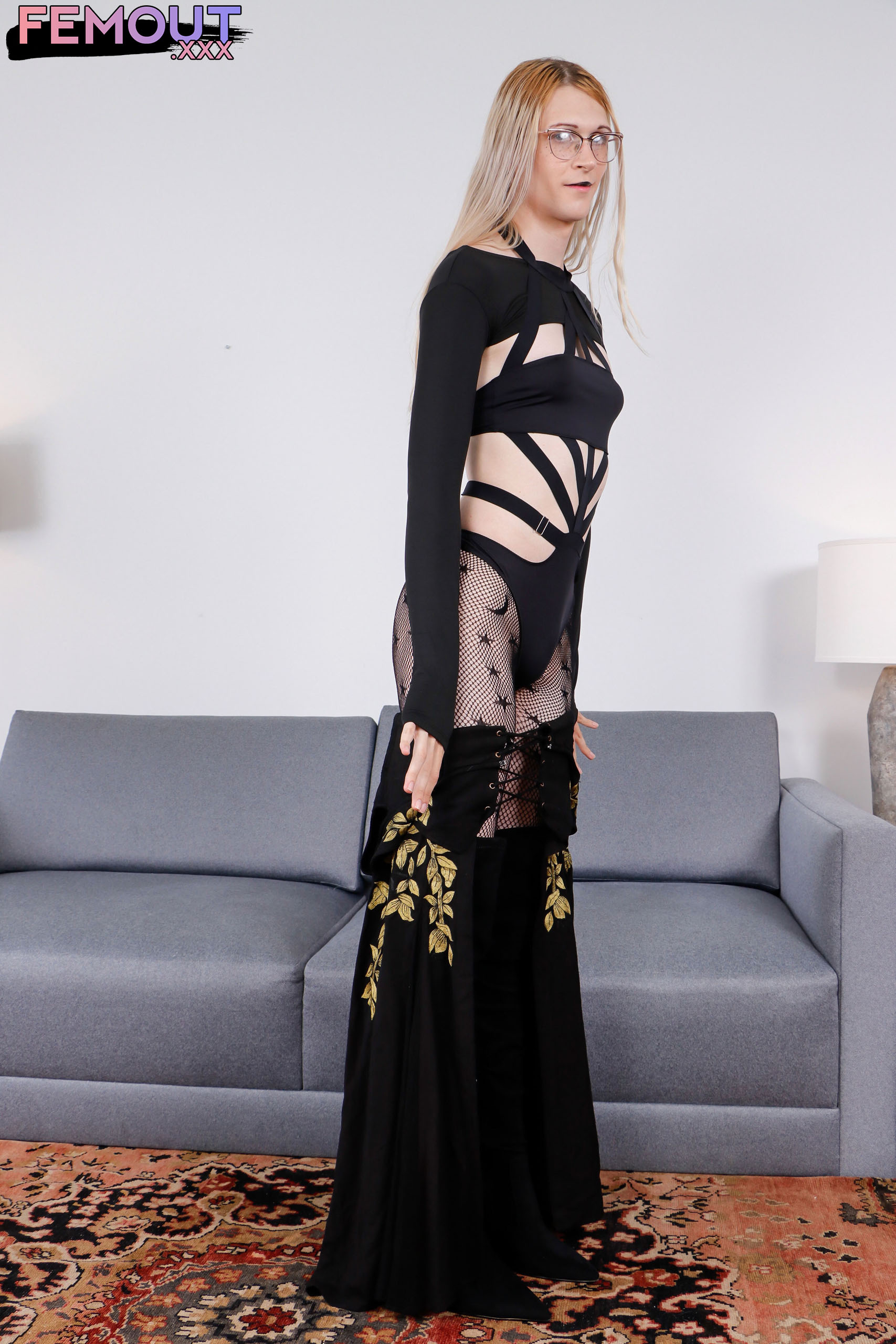 Quite the outfit that Fae chose to wear for this scene, and I think it sets her off perfectly - everything in black with only her pale, white skin and blonde hair contrasting against it, and the slight tinge of red in her lips. This is another nice strip down scene, with Fae's cock showing even harder than the previous set and that pink asshole, and white cheeks looking like they need some action. Another sexy set, from this sexy debut girl.