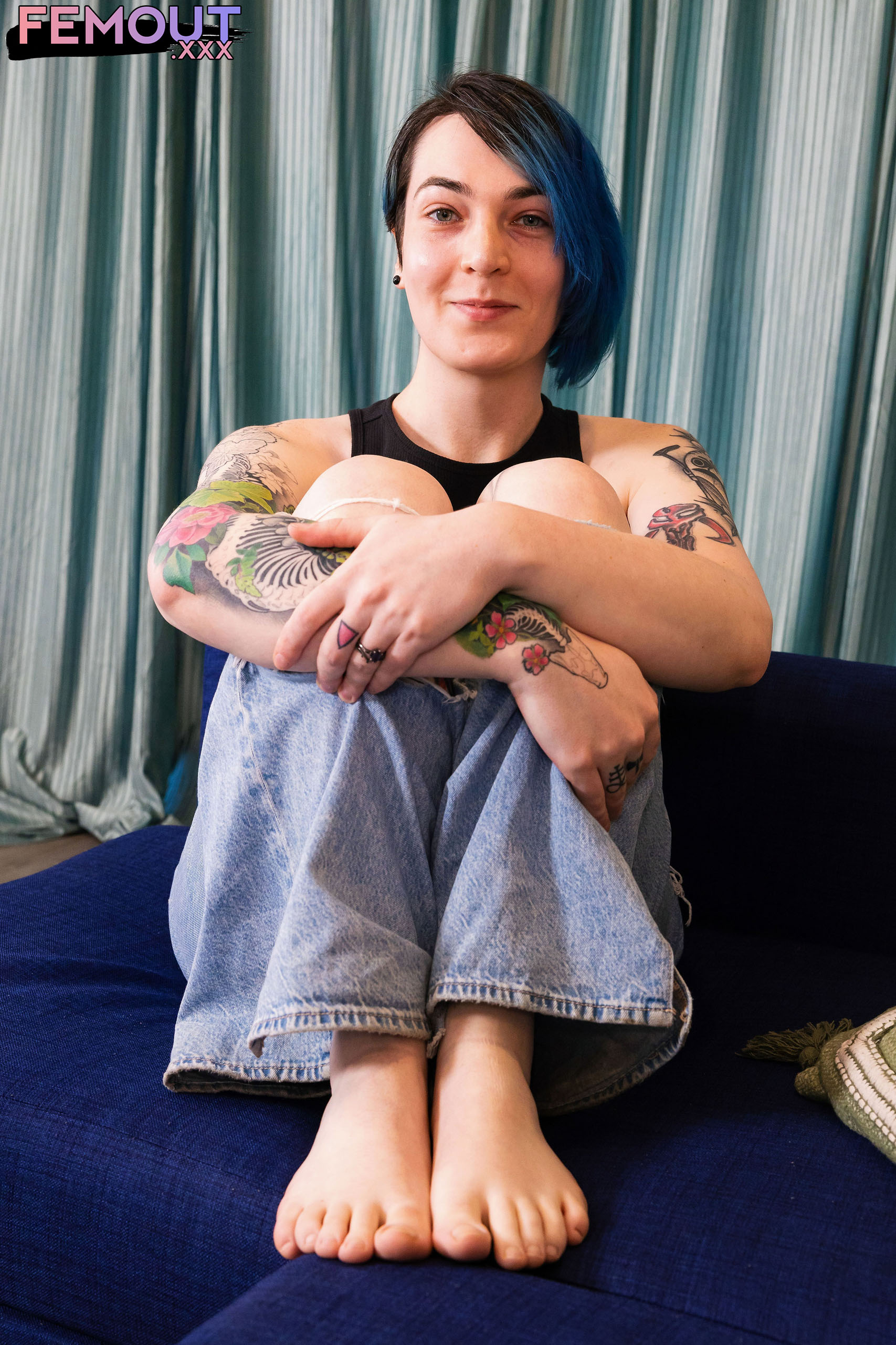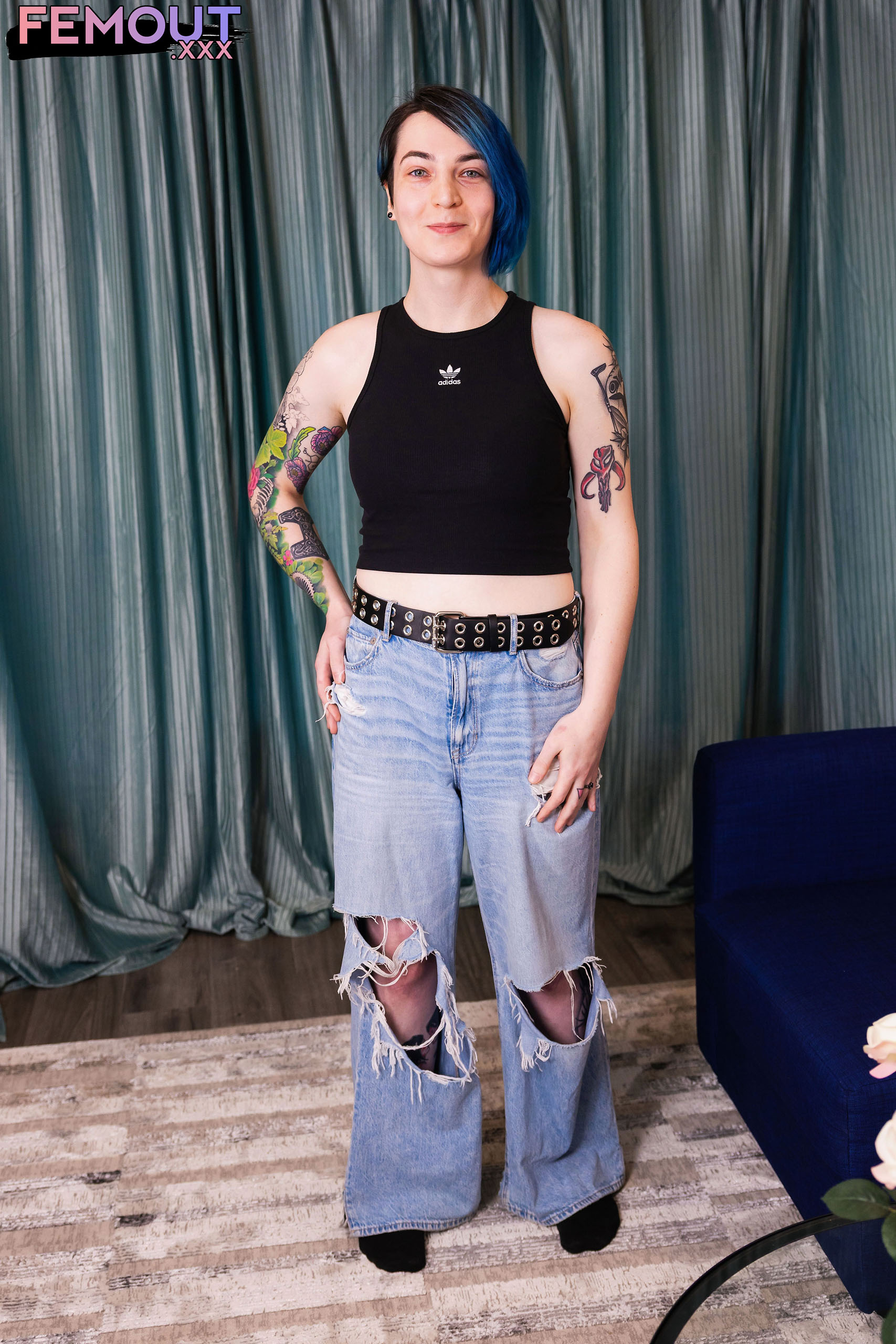 Here's a brand new girl from Washington state who goes by the name of Ivy Addams. She's a natural looking girl, with a pretty face who is in her late 20s, and is 5ft 8 - and with that blue hair, you'll see her coming. A nice smooth body, some great natural nubile breasts, some sexy legs and a good ass, with a hard cock up front that stands out straight and proud, and looking for love. Some really nice ink work on her body, gives her a unique look and appeal, and overall a nice debut set.