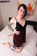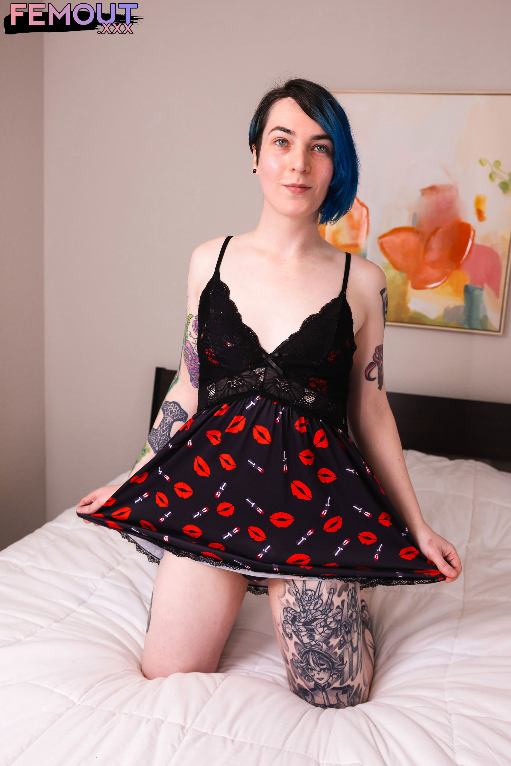 She's excited to be photographed by Moe, and exhibiting herself across the big white bed, so much so that she can barely contain herself, her cock springing out of her panties where it had been confined, hard and excited. She wears a black lace lingerie dress adorned with red lip prints, which complements her edgy aesthetic. Her vibrant blue hair and tattooed body add to her unique look, blending alternative fashion with sensuality. It's a great combination, as she has a nice innocent look which juxtaposes with her bending over and spreading those ass cheeks as wide as they can go, her pink hole stretching and ready for some fun. As she can't take it any longer, she plays with her cock until she brings herself to orgasm.